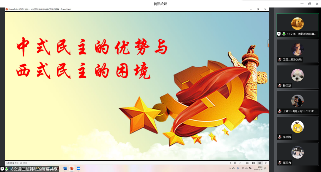 学生第二党支部通过腾讯会议的方式开展了以“中式民主的优势与美式民主的困境”为主题的党课学习。本次党课由党员韩旭同志进行讲解,参加本次党课学习的有二支部全体党员。