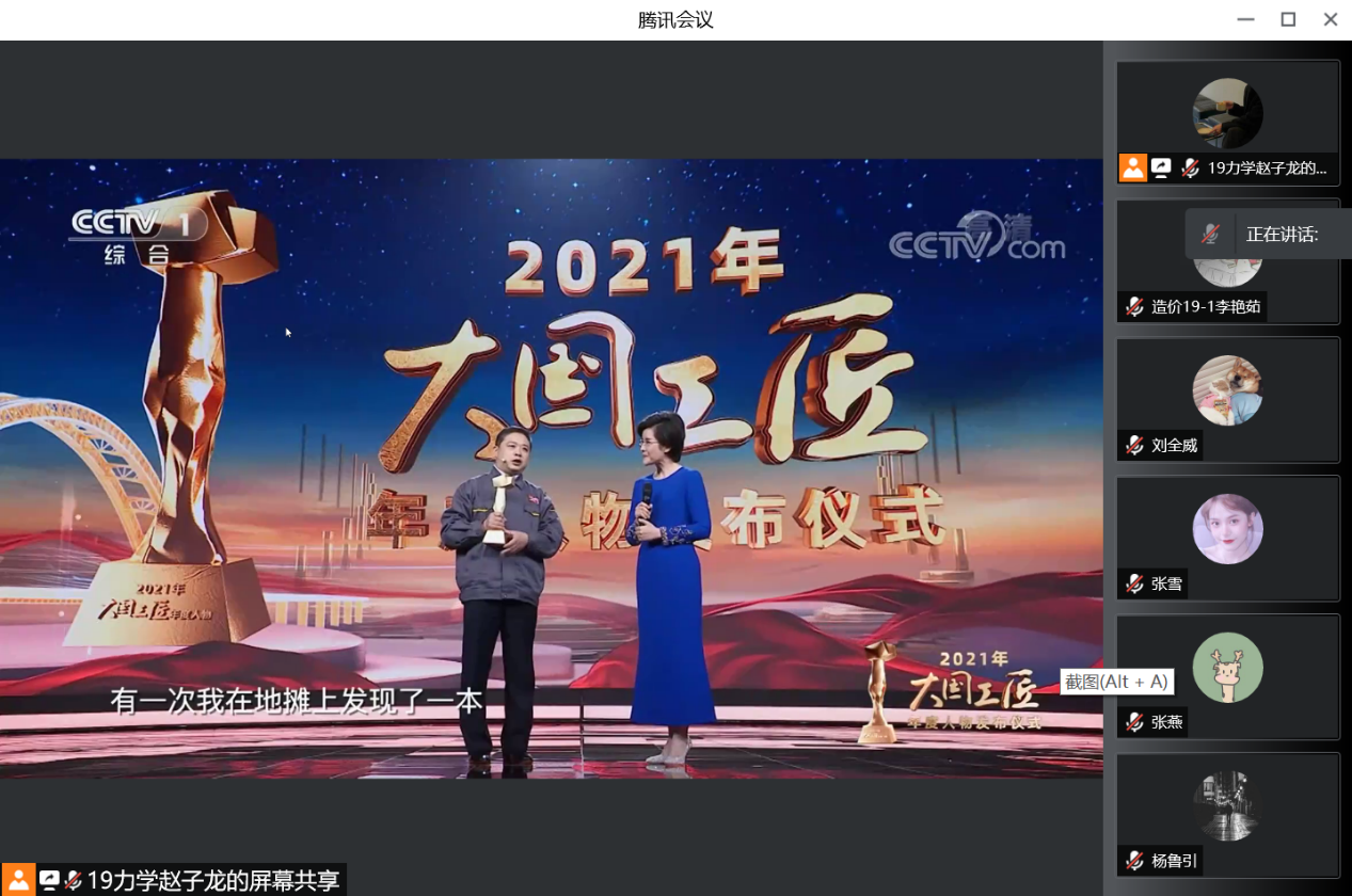 学生第三党支部组织进行了本月的党日观影活动,本次观影内容为“大国工匠2021年度人物颁奖典礼”,本次活动利用腾讯会议在线上进行,全体党员同志参与。