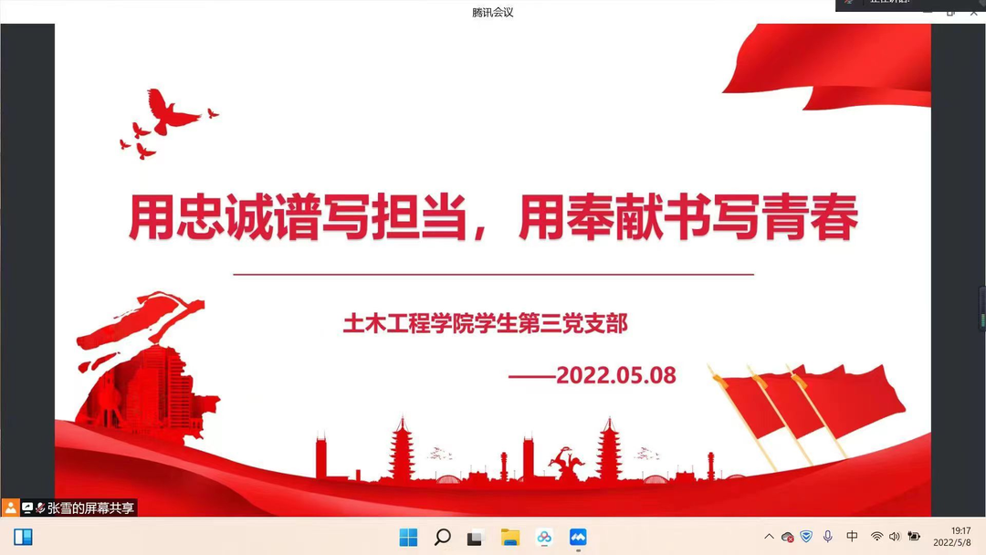学生第三党支部举办主题为“用忠诚谱写担当,用奉献书写青春”的接待。本次接待采用线上腾讯会议的形式开展。参加本次接待的党员有张雪同志、郝萌同志、王纳荷芽同志、张静同志。监督党员:姚亚东同志。