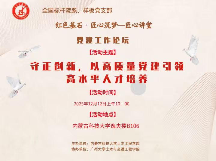 携手广州大学土木与交通工程学院,成功举办“红色基石·匠心筑梦——匠心讲堂”党建工作论坛。本次论坛以“守正创新,以高质量党建引领高水平人才培养”为核心主题,旨在搭建校际党建交流平台,共话新时代土木类专业人才培养新策略。