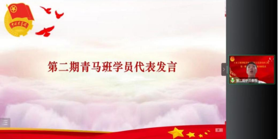 第二期青马班学员代表曹辉进行发言。曹辉表示要加强理论学习,用理论武装头脑,通过实践锻炼提高自身分析问题和解决问题的能力,自觉做一名坚定的马克思主义者。