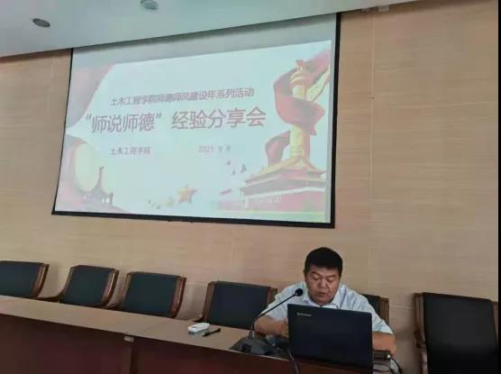 王英浩老师以PPT的形式与参会教师共同学习了师德师风建设的重要意义、目标、要求等,他指出:作为高校教师,要充分认识到教师职业的神圣使命,坚守师德底线,加强师德师风建设,增强使命感,提高人文素养和专业水平,关心爱护学生,积极奉献社会,努力成为受学生尊重的、有理想信念、有道德情操、有扎实学识、有仁爱之心的“四有”好老师。
