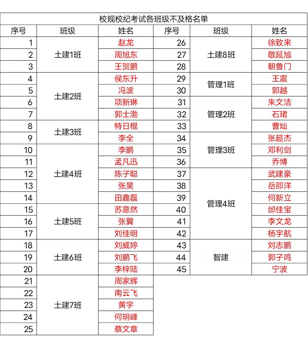 各班不及格人员名单