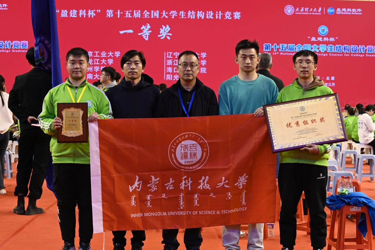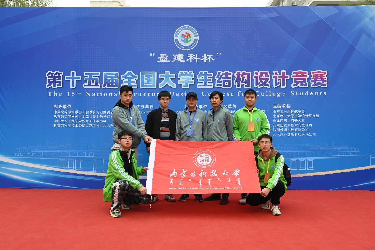 刘明超、刘靖、李雨杭3名同学组成的"金鹰战队"代表内蒙古自治区参赛。竞赛期间参赛队员利用0.2mm,0.35mm,0.5mm竹皮以及2mm*2mm,3mm*3mm,1mm*6mm的竹杆经过长达16个小时不间断的模型制作完成类似木塔结构,再进行不同断面的纵向、横向加载。我校代表队最终以104克的模型重量完成加载,取得了二等奖的佳绩,同时我校还获得了优秀组织奖。