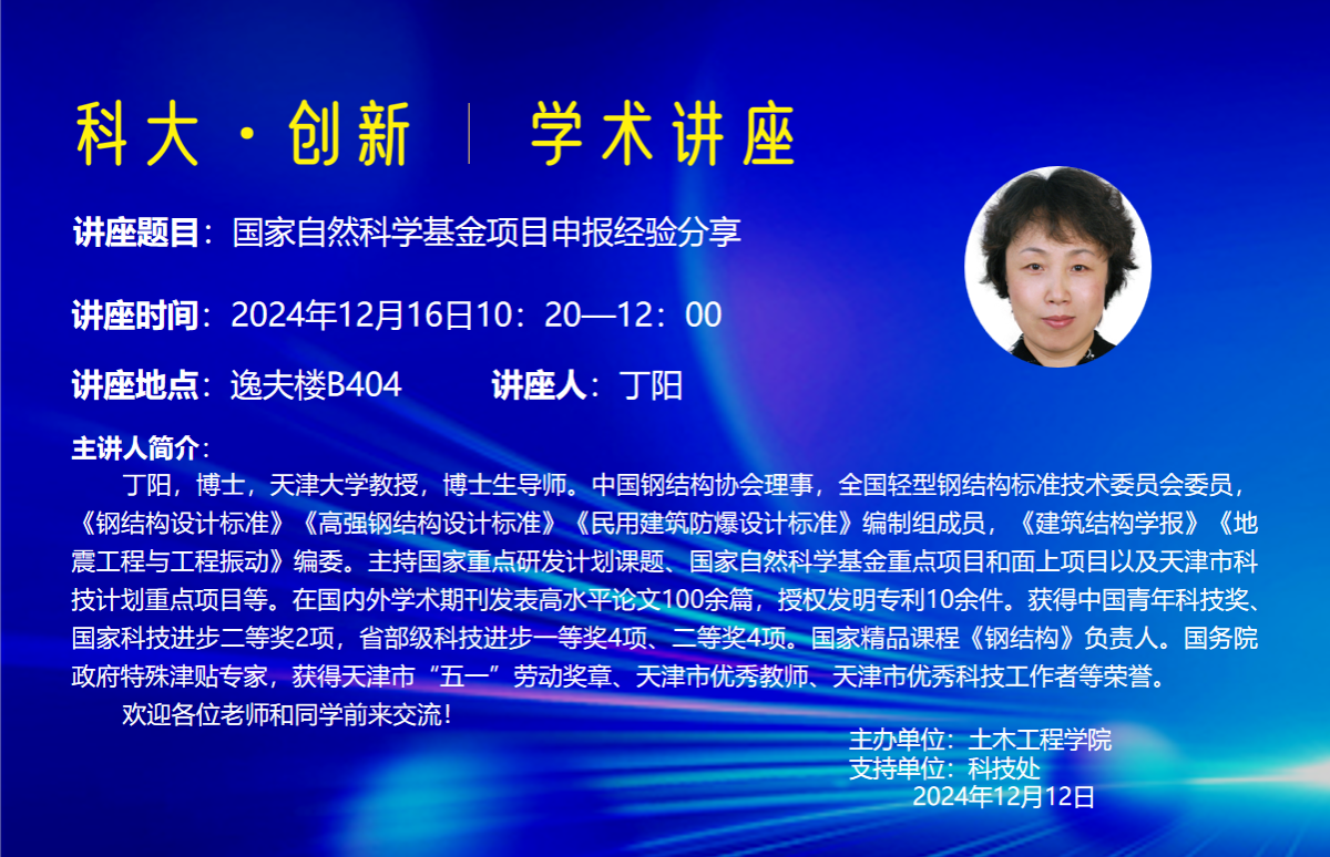 丁阳,博士,天津大学教授,博士生导师。中国钢结构协会理事,全国轻型钢结构标准技术委员会委员,《钢结构设计标准》《高强钢结构设计标准》《民用建筑防爆设计标准》编制组成员,《建筑结构学报》《地震工程与工程振动》编委。主持国家重点研发计划课题、国家自然科学基金重点项目和面上项目以及天津市科技计划重点项目等。在国内外学术期刊发表高水平论文100余篇,授权发明专利10余件。获得中国青年科技奖、国家科技进步二等奖2项,省部级科技进步一等奖4项、二等奖4项。国家精品课程《钢结构》负责人。国务院政府特殊津贴专家,获得天津市“五一”劳动奖章、天津市优秀教师、天津市优秀科技工作者等荣誉。