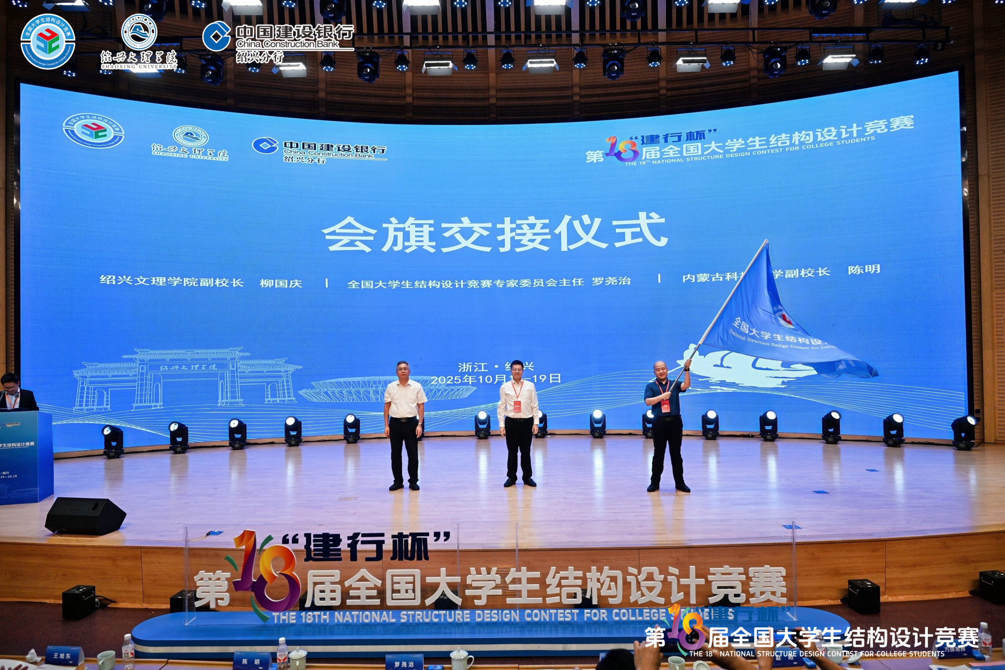 副校长陈明从主办方手中接过赛旗,标志着学校正式全面开启2026年第十九届全国大学生结构设计竞赛的筹备工作。