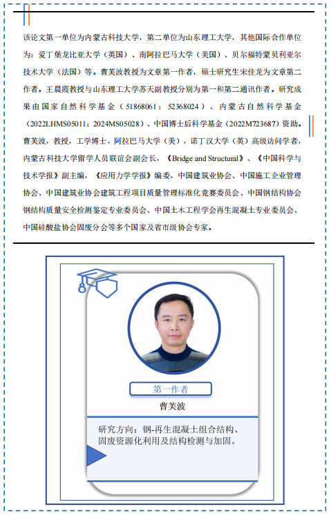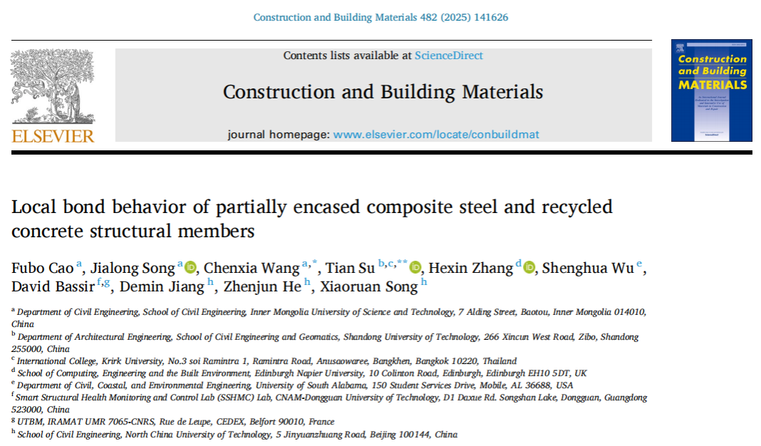 城市固体废弃物建材资源化利用团队曹芙波教授在Construction and Building Materials期刊(IF=7.4,中科院1区TOP)发表题为“Local bond behavior of partially encased composite steel and recycled concrete structural members”(DOI: 10.1016/j.conbuildmat.2025.141626)的研究成果。该研究通过推出试验探讨了部分包裹再生混凝土结构构件的黏结行为,并基于灰度相关理论评估了不同参数(再生混凝土强度、锚固长度和栓钉层数)对黏结性能的影响。最终,通过对试验结果统计回归,给出了考虑黏结部位和深度的黏结滑移本构模型。