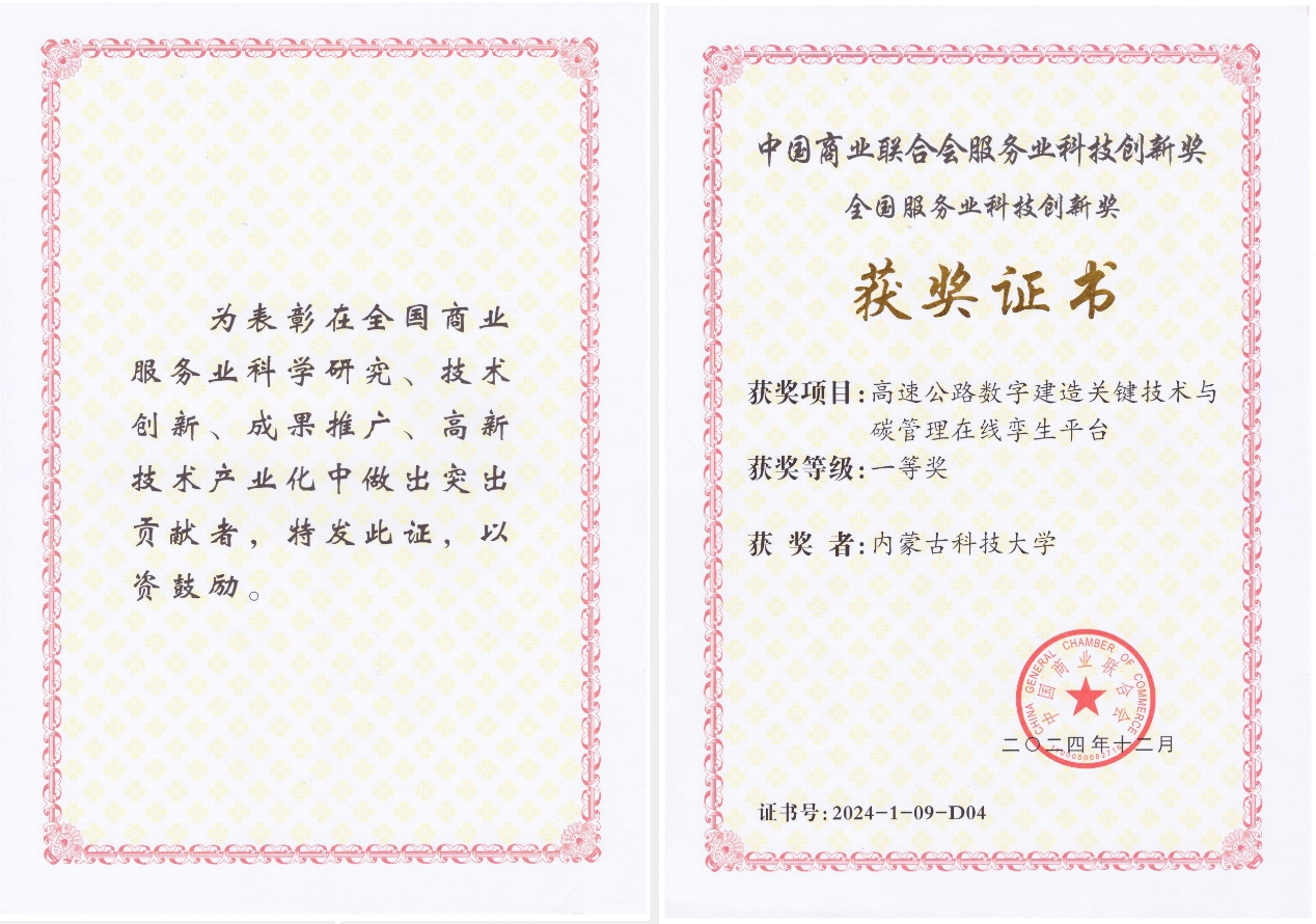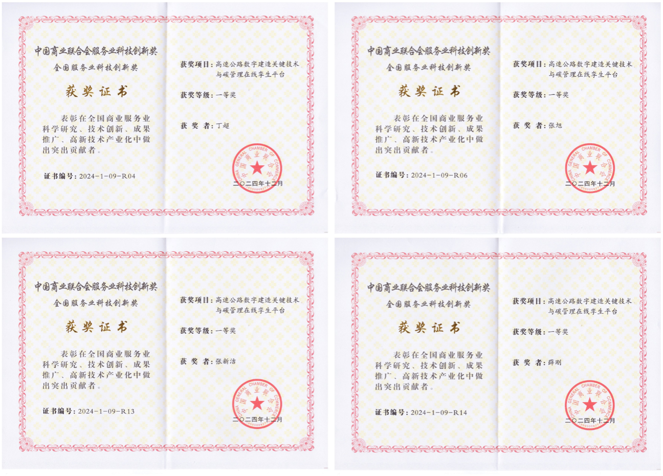 参与的科研项目获中国商业联合会服务业科技创新奖(全国服务业科技创新奖)一等奖,获奖项目为“高速公路数字建造关键技术与碳管理在线孪生平台”。