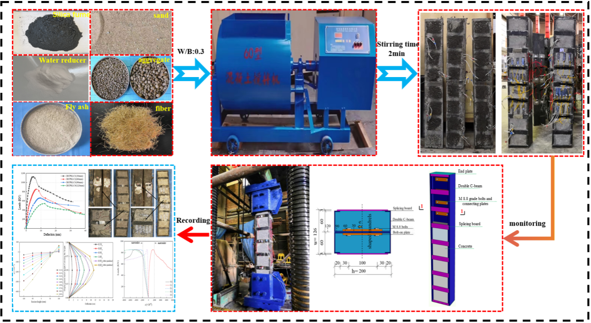 本研究针对轻钢构件竖向承载力低、抗侧力刚度不足、易失稳,制约轻钢房屋向多层发展的关键问题,创新性地提出将双C轻钢与免振捣、自重轻、韧性好的纤维增强自密实轻骨料混凝土(FSLC)结合,形成一种新型双C轻钢部分包覆FSLC组合柱以提高轻钢构件整体力学性能,避免发生稳定问题。在不同偏心距、FSLC 强度等级与缀板间距等因素影响下系统揭示其裂缝演化、破坏形态与力学性能发展规律,建立偏心受压条件下的承载力计算方法并验证其可靠性。研究成果不仅系统揭示双 C 型轻钢部分包裹 FSLC 组合柱的受力机制,更为轻钢与轻质高性能混凝土组合构件的设计优化与工程应用提供了理论支撑。