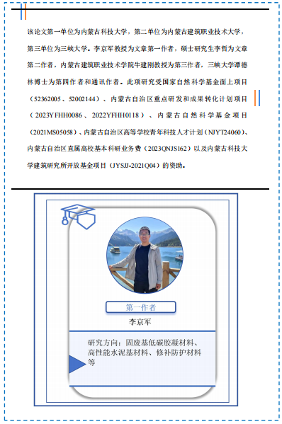 “151优秀青年教师”等人才专项计划。主要从事固体废弃物建材资源化利用、高性能水泥基材料、轻钢轻混凝土组合结构方面的基础和应用研究。近五年,作为项目负责人主持国家自然科学基金、内蒙古自治区重点研发(4项)、中央引导地方项目、内蒙古优秀青年基金等国家级及省部级项目12项,地市级项目3项,企业项目2项,累计课题经费500余万元。以第一作者或通讯作者身份发表高水平期刊论文40余篇,其中,中科院一区SCI(TOP期刊)15篇,授权发明专利5项,编写教材/专著3部,参与制定标准5部。