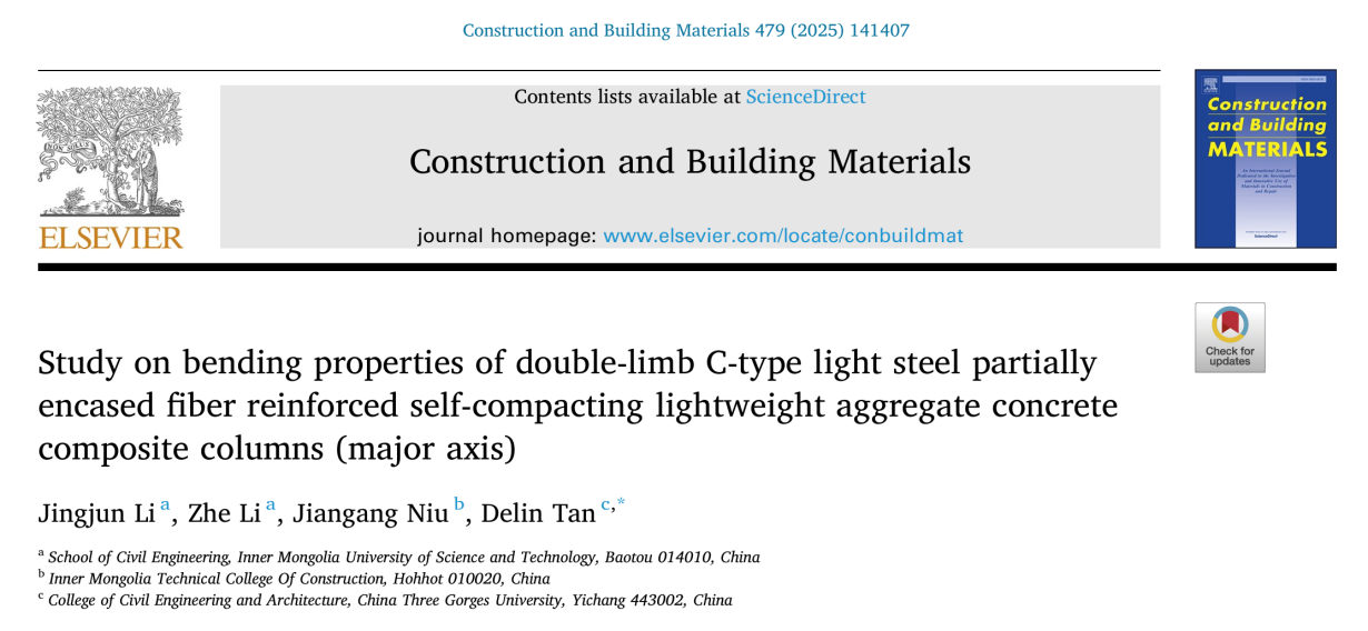 工业与城市固体废弃物建材资源化利用团队李京军教授在Construction and Building Materials期刊(IF=8.0,中科院1区TOP期刊)发表题为“Study on bending properties of double-limb C-type light steel partially encased FSLC composite column (major axis)”(DOI:10.1016/j.conbuildmat.2025.141407)的研究成果。