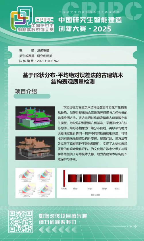 团队由研究生王子微、郎秀颖、李佳佳、王凯、吴创辉组成,在张爱琳老师的悉心指导下,长期聚焦古建筑木结构保护这一重要课题。古建筑作为中华民族历史文化的重要载体,其木结构构件因长期受自然环境侵蚀、虫害等因素影响,易出现变形、脱落等表观损伤。但现有保护手段存在一定局限性,难以满足古建筑保护与预防性修缮的需求。针对上述行业痛点,团队创新性提出一种融合三维激光扫描与几何分析的无损检测方法。该方法通过构建高精度古建筑数字孪生模型,为缺陷识别提供几何基准,采用形状分布法将构件三维形态抽象为二维分布曲线,再以平均绝对误差法定量计算同一构件不同时期曲线相似度,可精准识别毫米级裂缝及构件变形、脱落问题。为文化遗产数字化保护与科学修缮提供了可靠技术支撑,助力古建筑木结构的长效保护与传承。