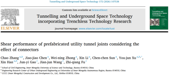 近日,亚洲色吧 隧道智慧建养与深地储能技术团队张朝副教授在Tunnelling and Underground Space Technology期刊(JCR一区,中科院一区TOPIF=7.4)发表题为“Shear performance of prefabricated utility tunnel joints considering the effect of connectors”(DOI: //doi.org/10.1016/j.tust.2026.107538)的研究成果。