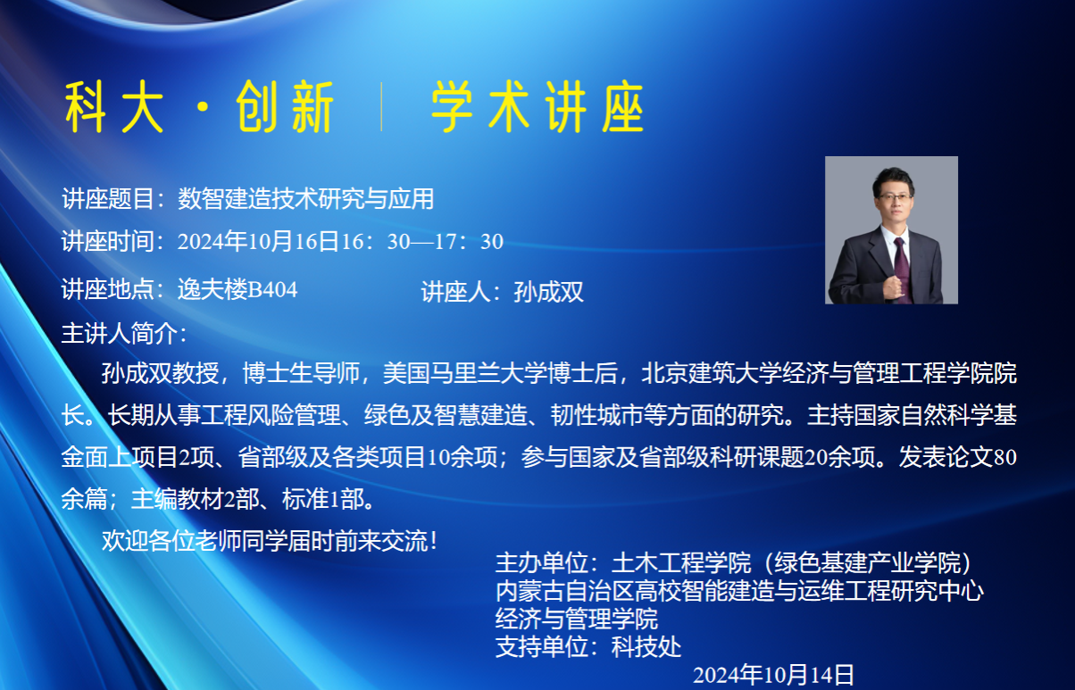孙成双教授,博士生导师,美国马里兰大学博士后,北京建筑大学经济与管理工程学院院长。长期从事工程风险管理、绿色及智慧建造、韧性城市等方面的研究。主持国家自然科学基金面上项目2项、省部级及各类项目10余项;参与国家及省部级科研课题20余项。发表论文80余篇;主编教材2部、标准1部。