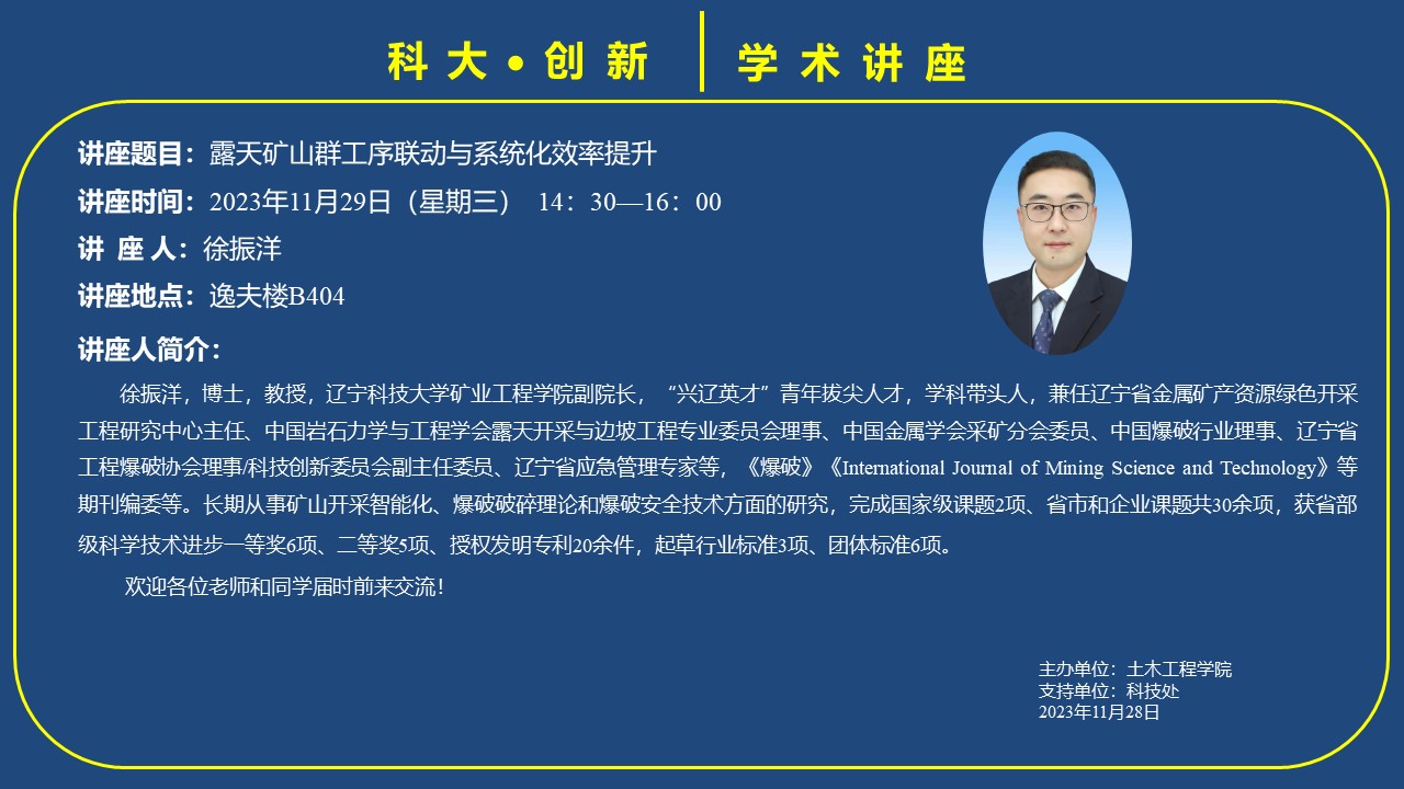徐振洋,博士,教授,辽宁科技大学矿业工程学院副院长,“兴辽英才”青年拔尖人才,学科带头人,兼任辽宁省金属矿产资源绿色开采工程研究中心主任、中国岩石力学与工程学会露天开采与边坡工程专业委员会理事、中国金属学会采矿分会委员、中国爆破行业理事、辽宁省工程爆破协会理事/科技创新委员会副主任委员、辽宁省应急管理专家等,《爆破》《International Journal of Mining Science and Technology》等期刊编委等。长期从事矿山开采智能化、爆破破碎理论和爆破安全技术方面的研究,完成国家级课题2项、省市和企业课题30余项,获省部级科学技术进步奖一等奖6项、二等奖5项、授权发明专利20余件,起草行业标准3项、团体标准6项。