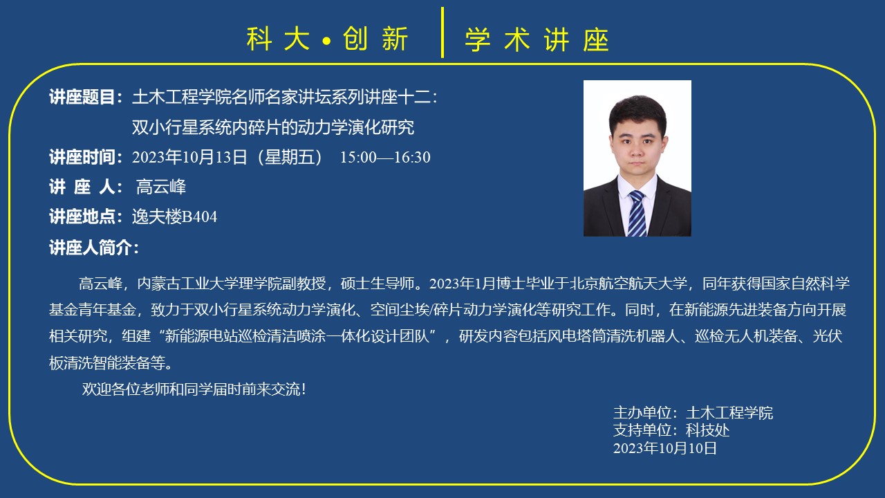 高云峰,内蒙古工业大学理学院副教授,硕士生导师。2023年1月博士毕业于北京航空航天大学,同年获得国家自然科学基金青年基金,致力于双小行星系统动力学演化、空间尘埃/碎片动力学演化等研究工作。同时,在新能源先进装备方向开展相关研究,组建“新能源电站巡检清洁喷涂一体化设计团队”,研发内容包括风电塔筒清洗机器人、巡检无人机装备、光伏板清洗智能装备等。