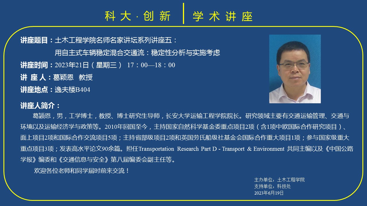 讲座题目:用自主式车辆稳定混合交通流:稳定性分析与实施考虑