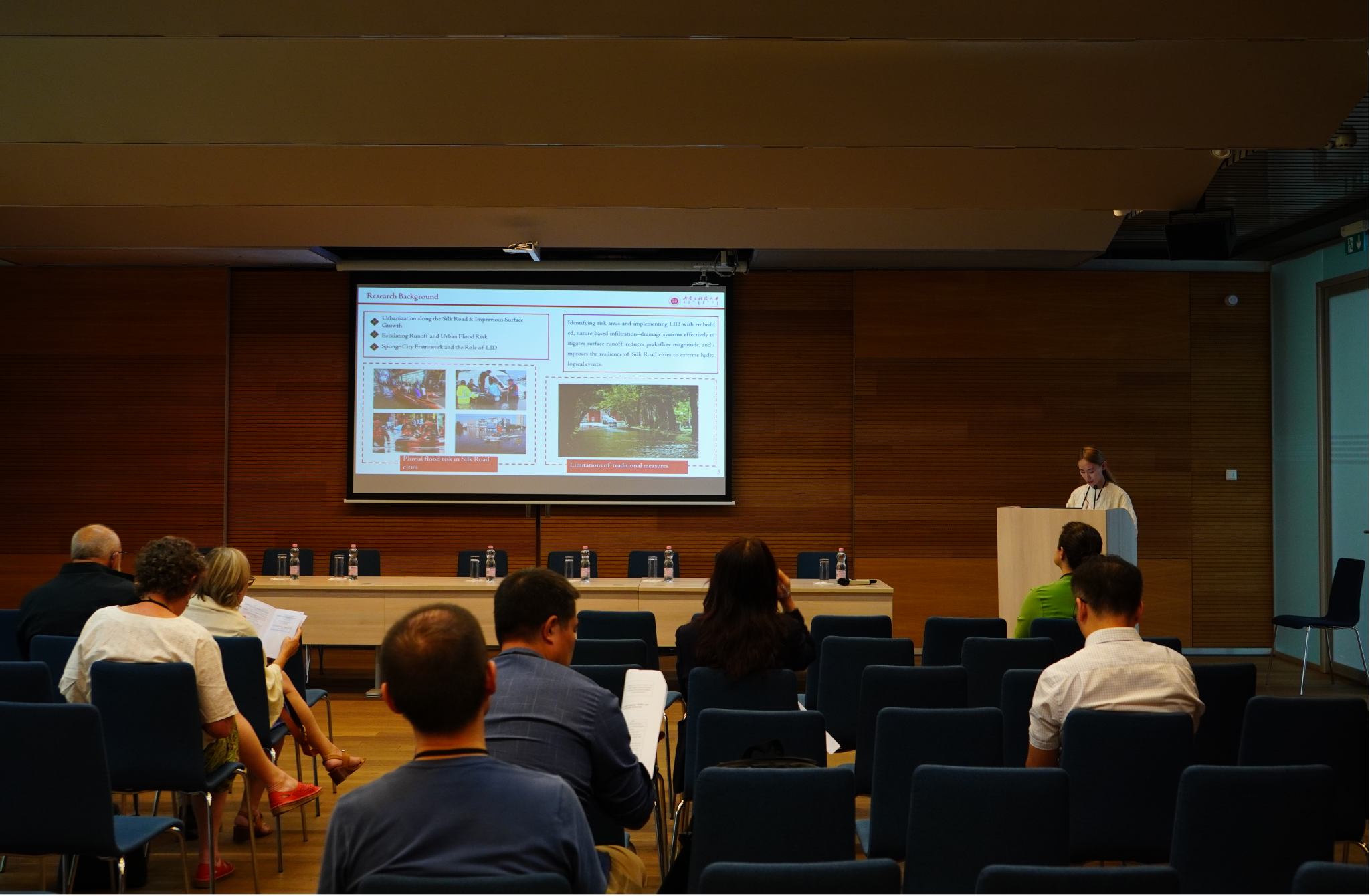 丁超副教授、匈牙利农业与生命科学大学Ildikó Rudnák教授、György Kerezsi副教授的指导下共同完成。聚焦于全球气候变化与人类社会的互动关系,从历史视角与现代计算机技术相结合的角度,探讨了城市水资源治理的演变路径与未来应对策略。研究以丝绸之路城市为例,探讨气候变化对城市水安全的影响,并提出融合历史智慧与人工智能结合的新型治理框架。报告回顾了从古代坎儿井到东方运河等历史水治理经验,指出传统社会在应对干旱与内涝中形成了可持续的地方知识体系。研究进一步比较了东欧与东亚现代城市的治理模式,分析多层级协调、公众参与与制度韧性等关键因素。在方法上,采用多目标优化算法,构建多维数据模型识别城市内涝风险的主要影响因素,实现了决策的多元优化。研究提出应通过“历史经验+数据智能”的融合路径,提升城市水资源治理的战略性与适应力,为全球气候变化下的城市可持续发展提供创新思路。她的汇报得到了来自中国科学院、匈牙利科学院、匈牙利罗兰大学、德国吉森大学等多国专家的肯定,也提出了多项建设性意见和建议,就研究方法、数据应用及后续拓展方向进行了交流,这些意见为后续研究提供了宝贵的启发和思路。