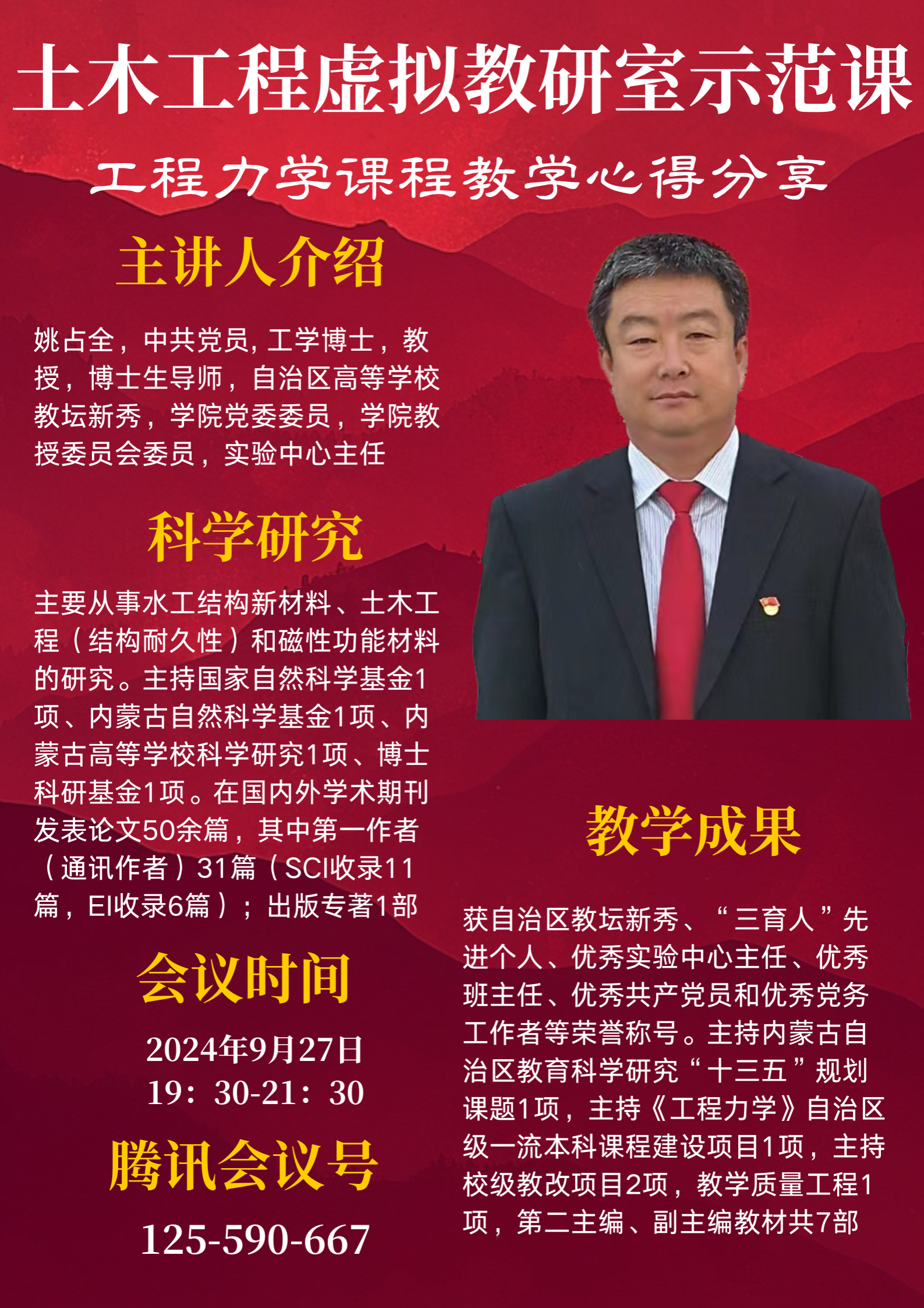 2024年9月27日晚,土木工程虚拟教研室第六场示范课成功举办。自治区高等学校教坛新秀、博士生导师姚占全教授以"工程力学课程教学心得分享"为主题,通过腾讯会议平台呈现了一场内容丰富、见解独到的教学经验交流会,吸引了全国多所高校教师和研究生的热烈参与。